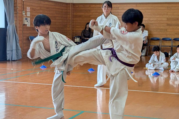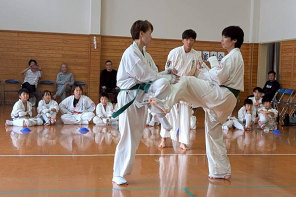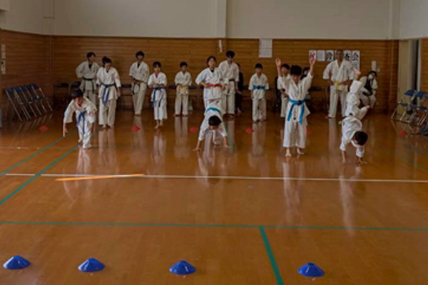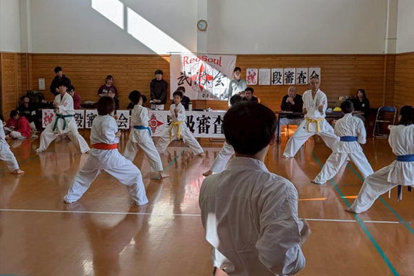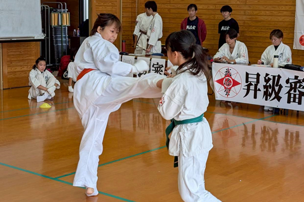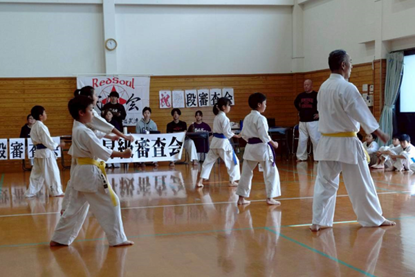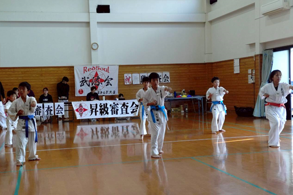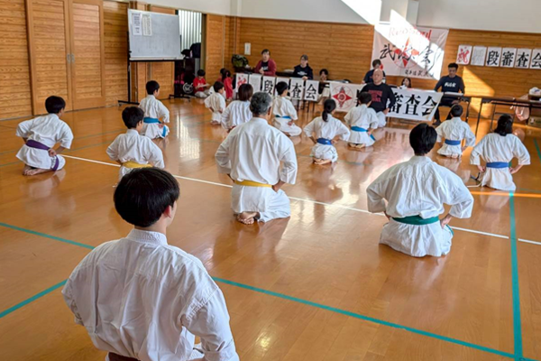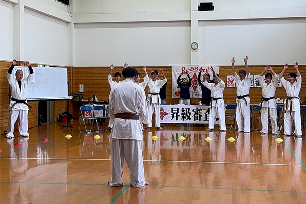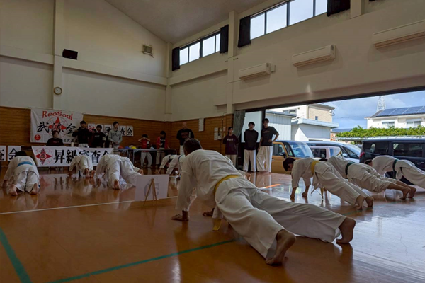 課題は、筆記試験、柔軟、基本稽古、移動稽古、型、組手。